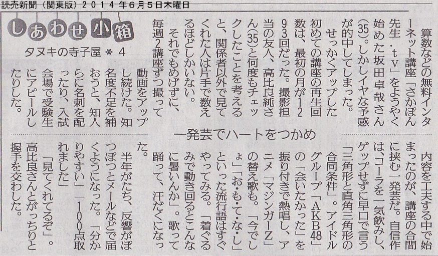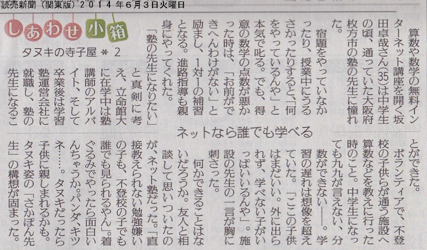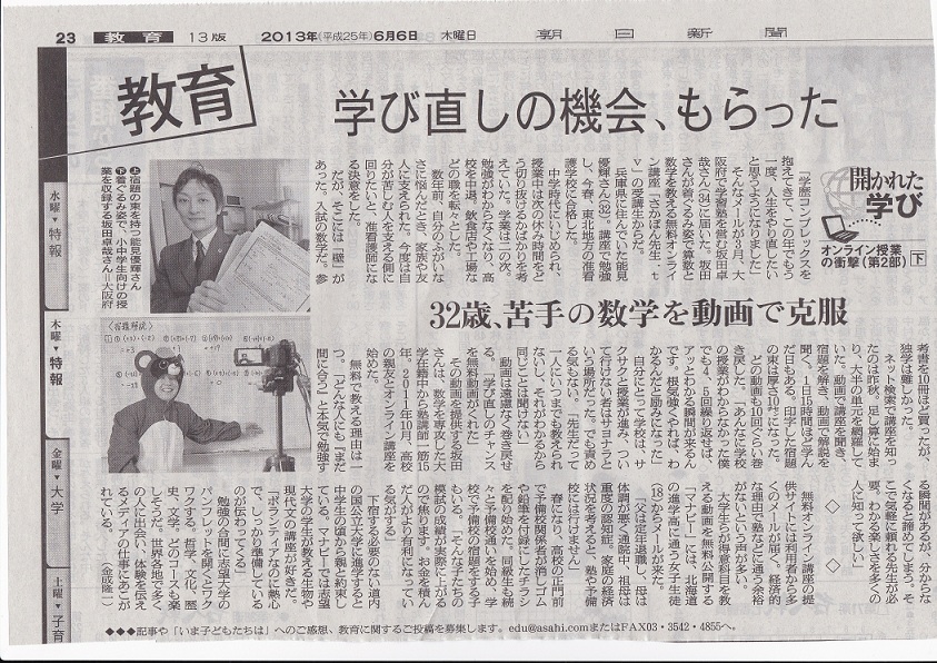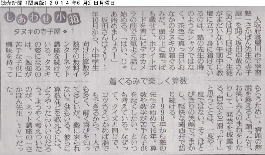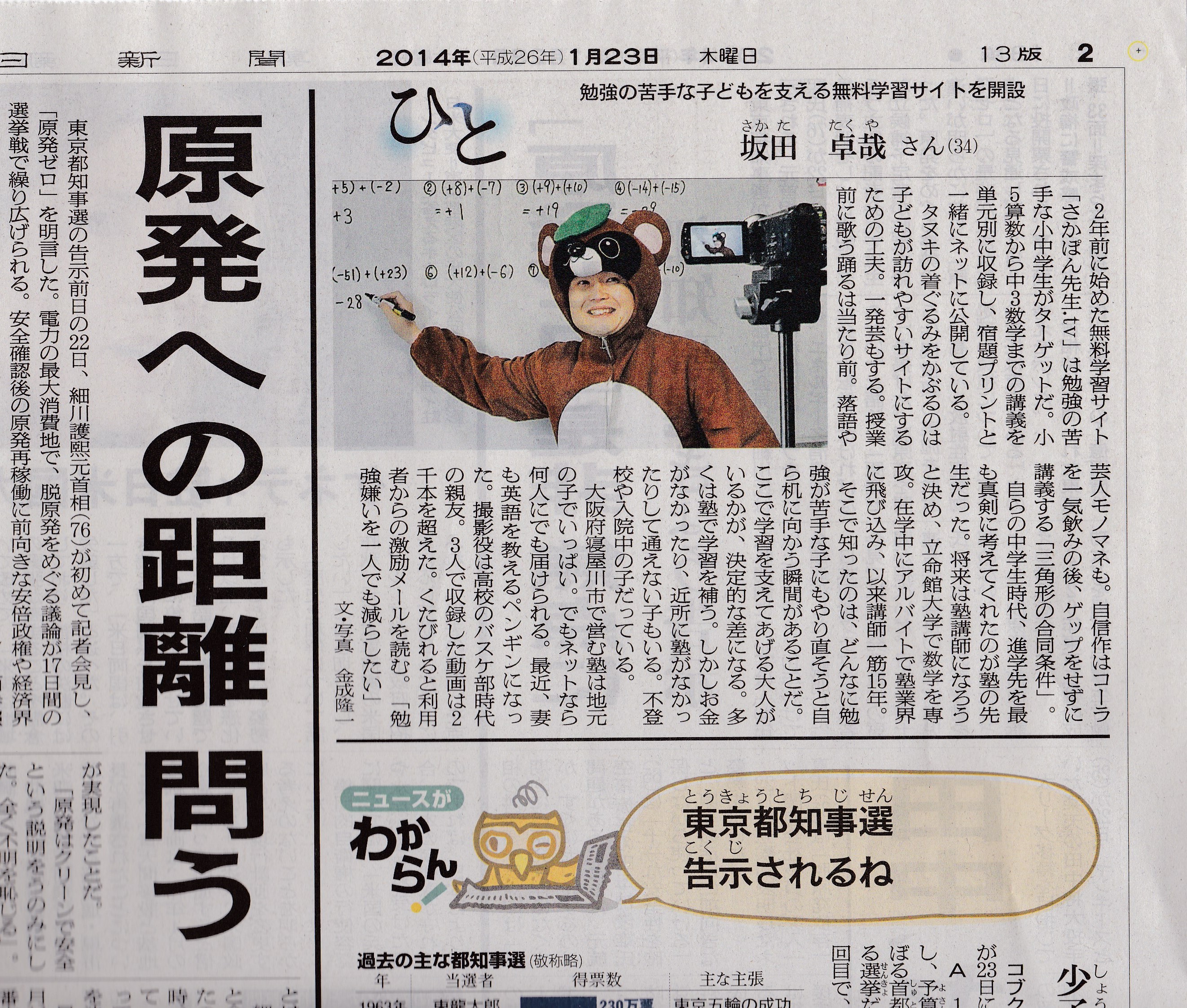 こんにちは。カナダのアルバータ州に住んでいる中学三年生です。日本から移住してもう9ヶ月以上になります。日本人学校は遠すぎて通っていません。日本の授業に置いていかれないように兄弟みんなで持って来た教科書で数学と国語を勉強しています。しかし、弟の算数の教科書が引っ越し中になくなってしまいとても困っていました。そこで母がさかぽん先生のサイトを見つけました。それから弟は教科書代わりに勉強しています。弟がさかぽん先生のサイトを使っているので僕も使ってみることにしました。使ってみたところさかぽん先生の授業は楽しく、自分で教科書を読むよりだいぶ分かりやすいです。こんなに素晴らしい授業を無料で受けられるなんてびっくりです。さかぽん先生は僕達の救世主です!!この調